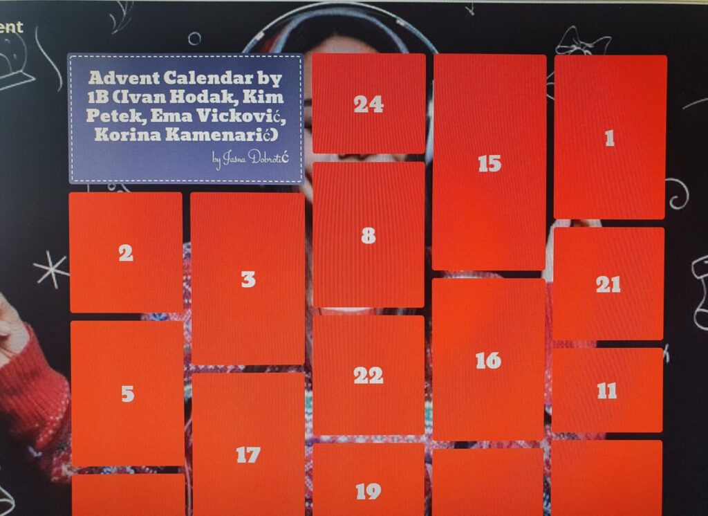 Učenici 1.B razreda Ivan Hodak, Kim Petek, Korina Kamenarić i Ema Vicković su na dodatnoj nastavi iz engleskog jezika izradili plakat adventskog kalendara s 24 ideje za svaki dan adventa. Plakat je trebao ukrašavati hol škole počevši od 1.12.. S obzirom da se nastava trenutno odvija online, mi smo odlučili svoj plakat pretvoriti u online izdanje. Svratite svaki dan po lijepi prijedlog umjesto slatkiša!