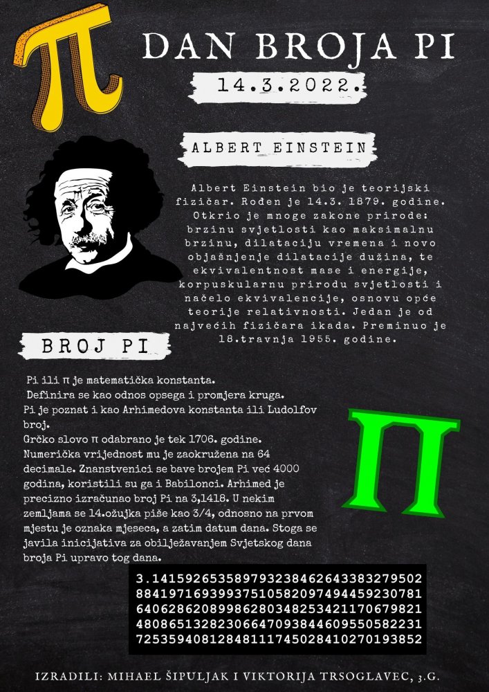 Dan broja pi je godišnja proslava kojom se obilježava matematička konstanta π. Dan broja pi obilježava se 14. ožujka jer su 3, 1 i 4 tri najznačajnije znamenke broja π u decimalnom zapisu. Pi ili π je matematička konstanta koji se definira kao omjer opsega i promjera kruga. Također poznat i kao Arhimedova konstanta ili Ludolfov broj. U praksi se bilježi malim grčkim slovom π, a u hrvatskom jeziku je pravilno pisati i Pi. Također 14.3. je i datum kada je rođen Albert Einstein 1879. g. i 15.3. 2019 je umro Stephen Hawking s 76 godina.
