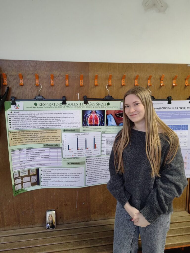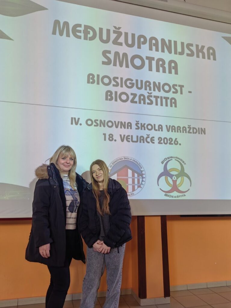 U srijedu, 18.02.2026. godine, u IV. osnovnoj školi Varaždin održana je Međužupanijska smotra biosigurnosti i biozaštite. Našu je školu uspješno predstavila učenica 2.a razreda Nika Smogor, koja je izložila svoj istraživački poster na temu “Respiratorne bolesti u našoj školi”, izrađen u suradnji s učenicom 2.a razreda Letizijom Šimunec.