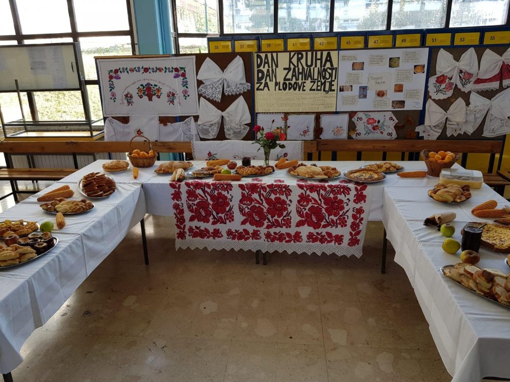 Stolovi u holu bili su ukrašeni kruhom, pecivima i kolačima koje su ispekle mame i bake naših učenika te učenici 2.e i 3.e u sklopu praktikuma iz kuharstva uz pomoć svojih voditelja Biljane Gajski i Zdravka Benedika.