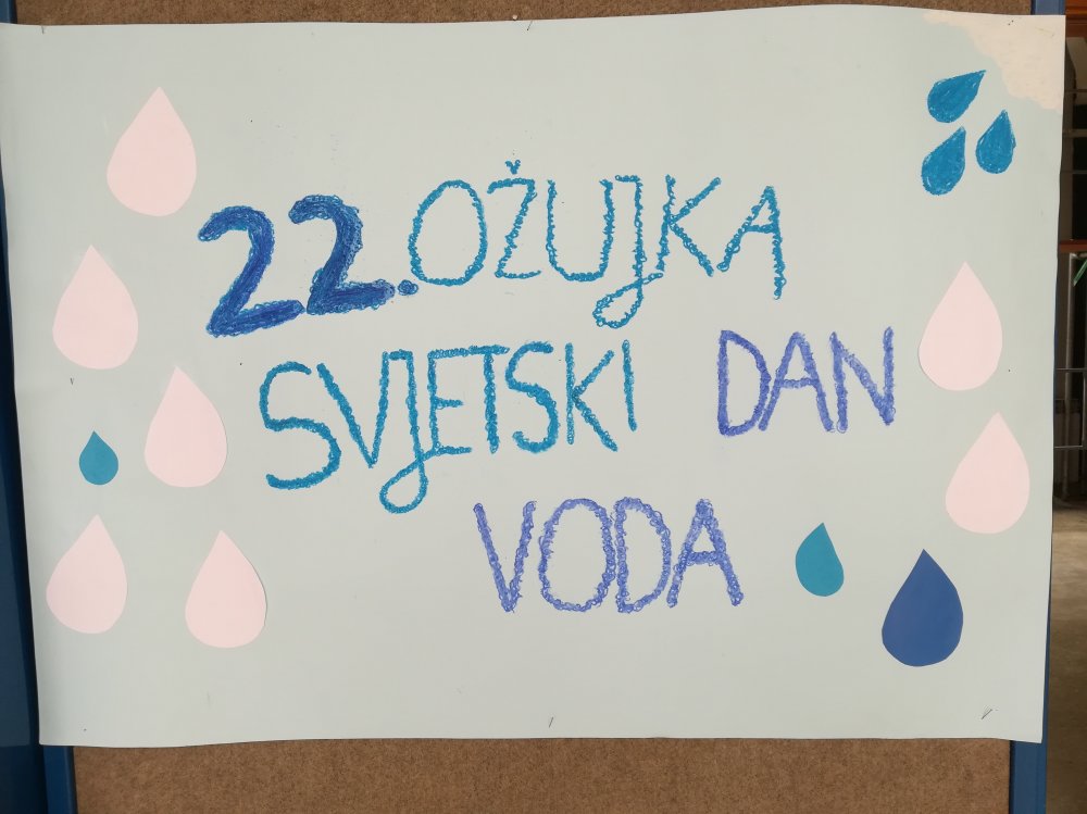 Svjetski dan voda obilježava se svake godine 22. ožujka. Ove godine obilježili smo ga na nešto drugačiji način. Cjelokupnu ideju osmislila je profesorica Anica Hrlec, a u realizaciji su joj pomogle profesorica Ivana Perković i Sanja Lugarić. Učenici 2.a i 2.b na izbornoj su nastavi iz Biologije napravili plakate koji trenutno ukrašavaju prazne školske hodnike. Njihov je zadatak bio zapisati zanimljive izreke i misli o vodi. Drugi učenici svoje su plakate izradili pomoću različitih digitalnih alata tako da su istovremeno podizali svijest o važnosti vode i informatičkoga opismenjavanja. Učenice 4.b i 2.g proučavale su hrvatsko pjesništvo i prozu, a učenice 4.a izdvojile su simbole koje povezujemo uz vodu i donijele prikaz vode u popularnoj kulturi.