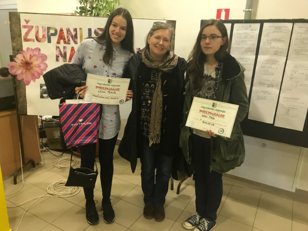 U ponedjeljak 12.3. 2018. održano je Županijsko natjecanje iz biologije učenika osnovnih i srednjih škola Zagrebačke županije. Nakon provedenih školskih natjecanja, županijsko stručno povjerenstvo sastavilo je ljestice poretka te je tako na Županijskom natjecanju iz biologije u kategoriji osnovne škole uvršten 21 učenik sedmog razreda i 27 učenika osmog razreda.  U kategoriji srednje škole u prvom razredu natjecalo se 10 učenika, u drugom razredu 10 učenika, 11 učenika trećeg razreda te 5 učenika četvrtog razreda. Na natjecanju su sudjelovale dvije naše učenice Ivona Prša (4.b) i Leona Periša (2.b) u dvije različite kategorije te su ostvarile odlične rezultate. IVONA PRŠA (4.b) – osvojila je u  2.mjesto u natjecanju u znanju dok je  LEONA PERIŠA (2.b) – osvojila  1.mjesto u kategotriji istraživačkih radova. Rad je poslan drzavnom povjerenstvu na recenziju i ocjenjivanje pa moguci poziv na državno natjecanje čekamo. Čestitamo našim učenicama i njihovoj mentorici Sanji Lugarić.